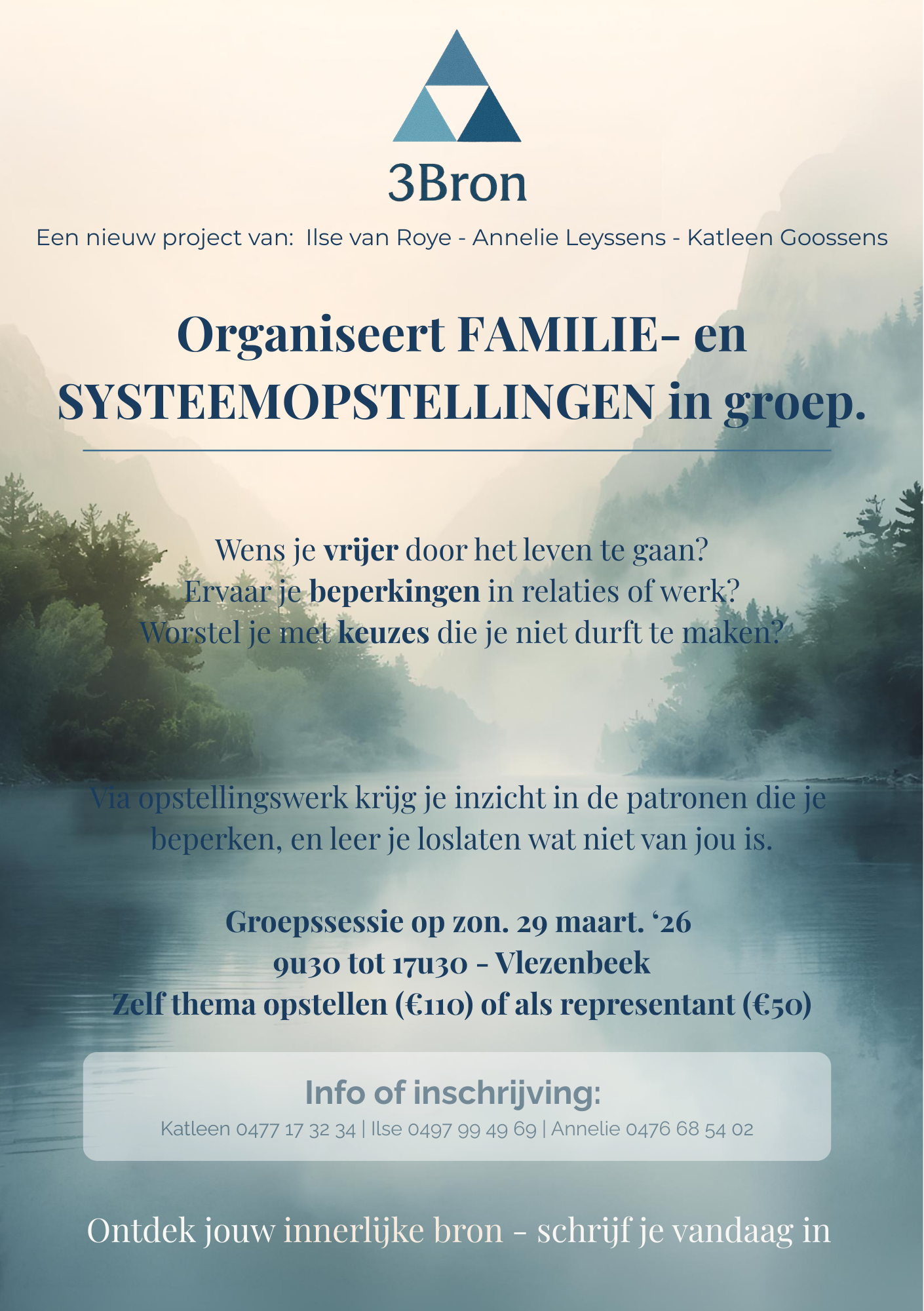 Wil je meer inzicht krijgen in de patronen die je leven, relaties of werk beïnvloeden? Tijdens deze groepssessie familie- en systeemopstellingen krijg je de kans om op een diepere laag te kijken naar wat jou mogelijk belemmert in je keuzes of je vrijheid om voluit te leven.